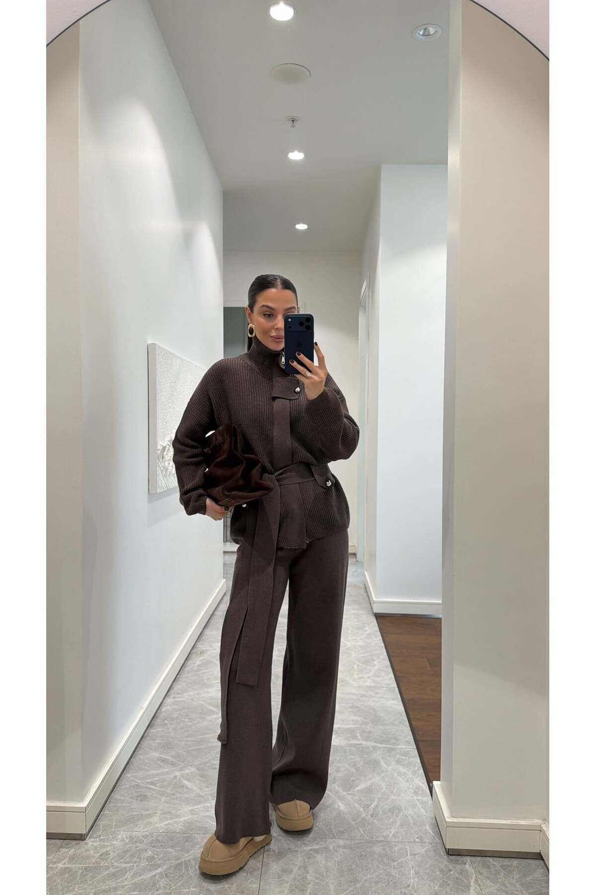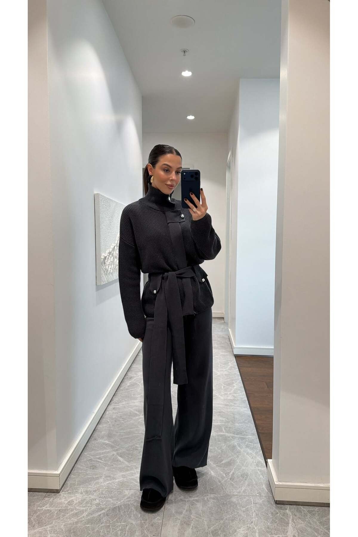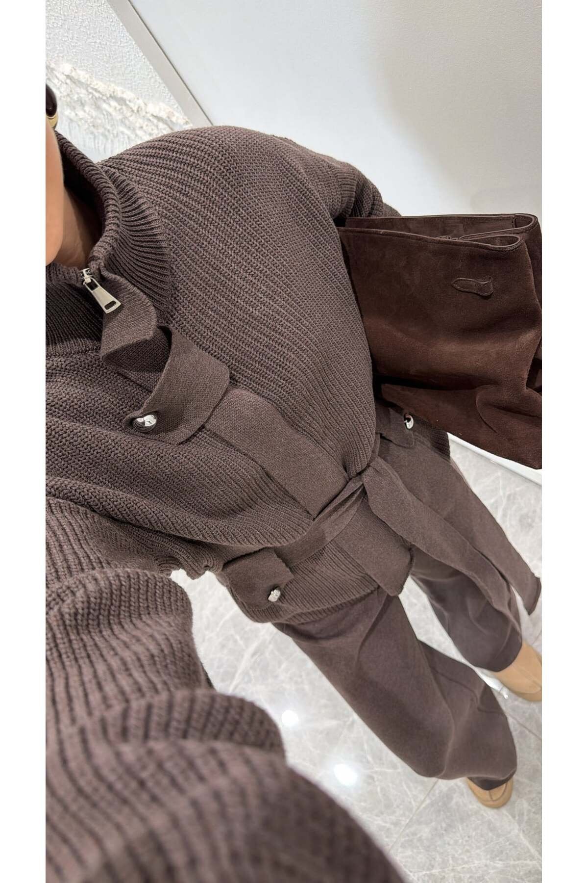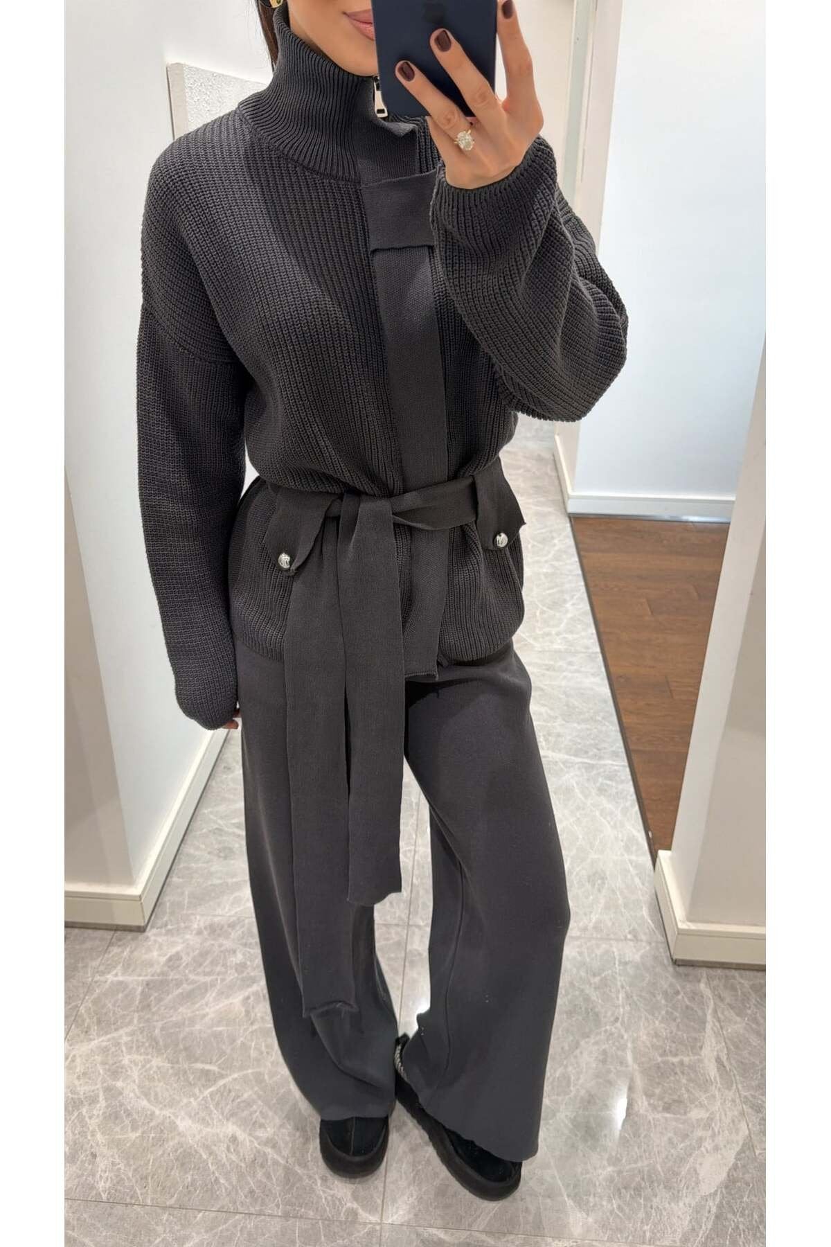 Bu şık triko takım, hem konforu hem zarafeti bir arada sunan modern kadınların gardırobunda vazgeçilmez bir parça olacak. Yumuşacık dokusu ve oversize kesimiyle gün boyu rahatlık sağlayan takım, bel kısmındaki kuşak detayıyla vücut formunu zarifçe ortaya çıkarır. Yüksek yakası ve iri düğme detaylarıyla minimal ama güçlü bir stil sunarken, geniş paça triko pantolonu modern bir siluet oluşturur.
