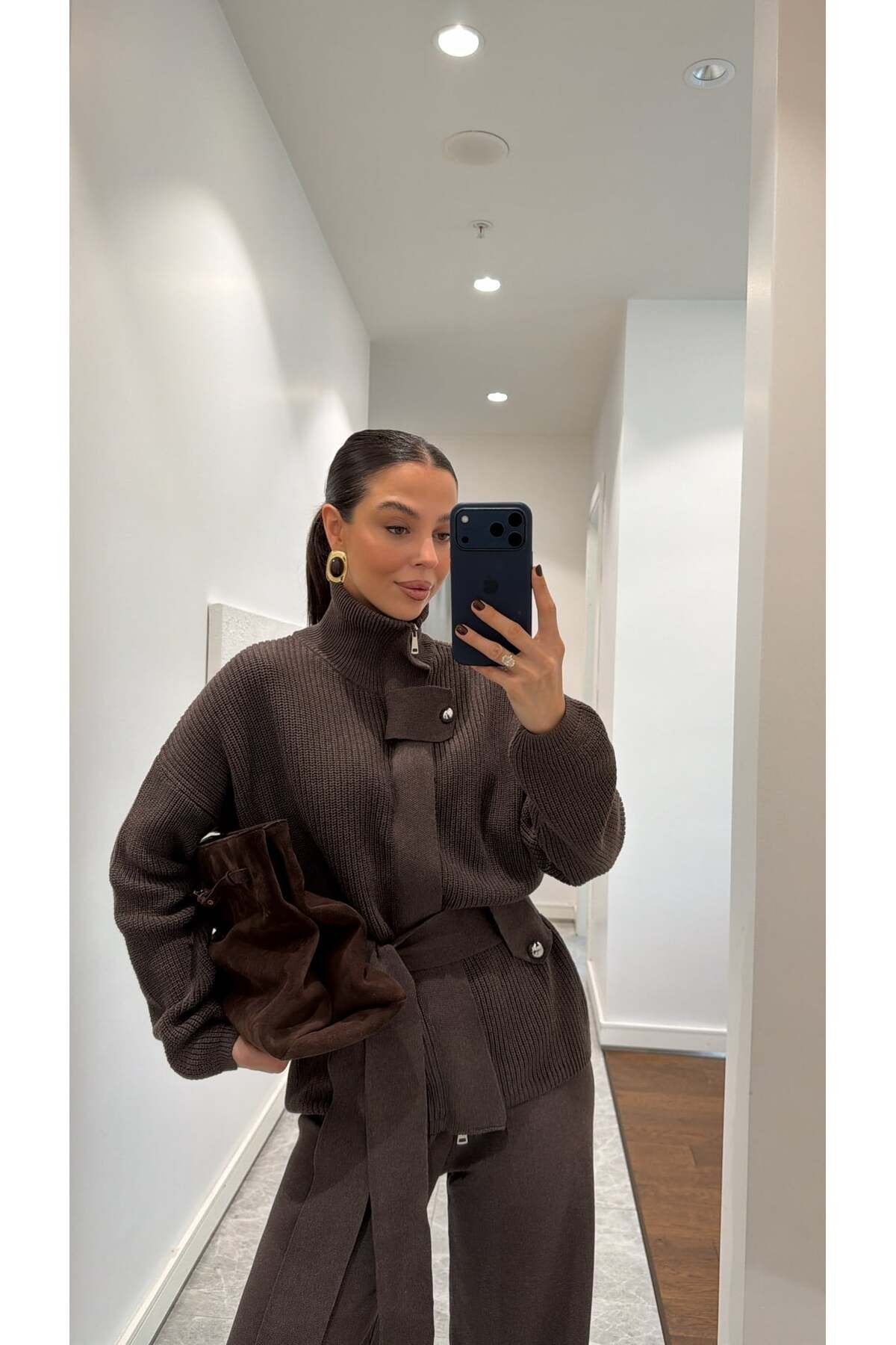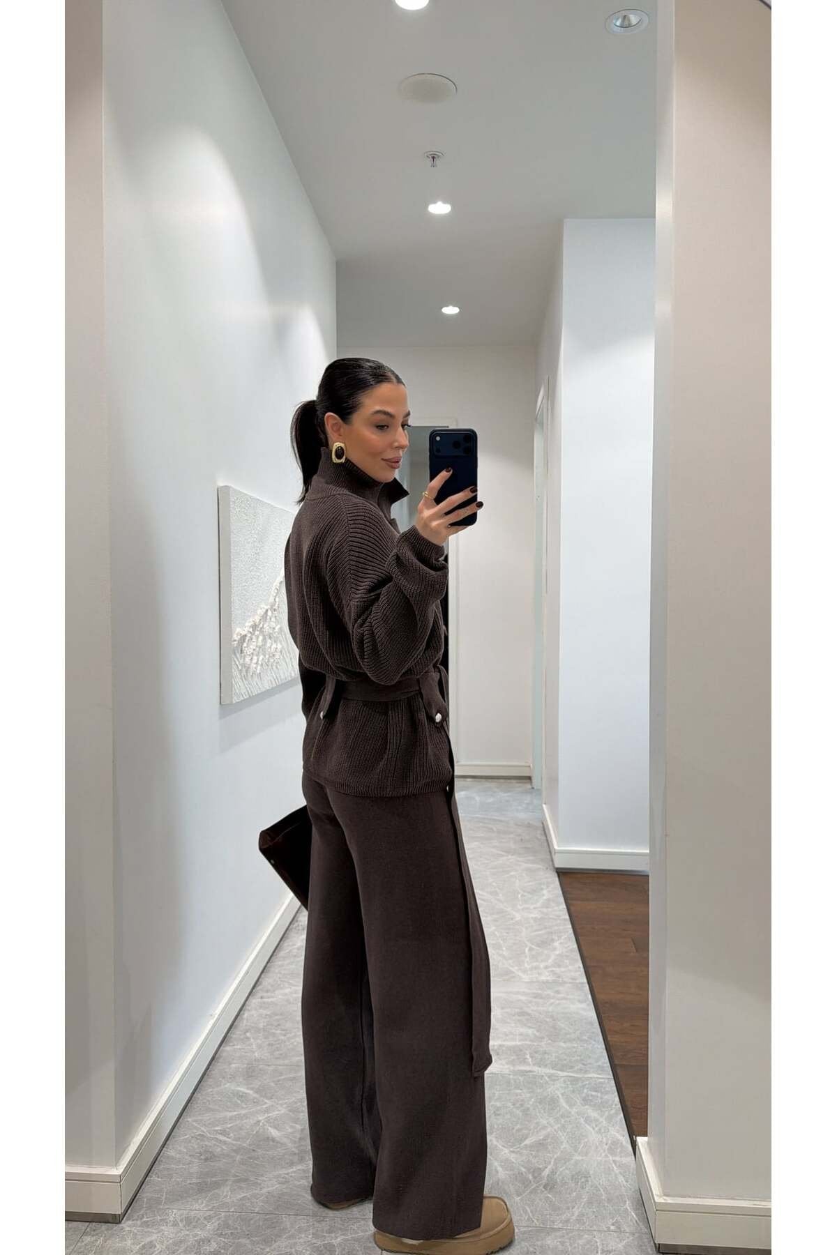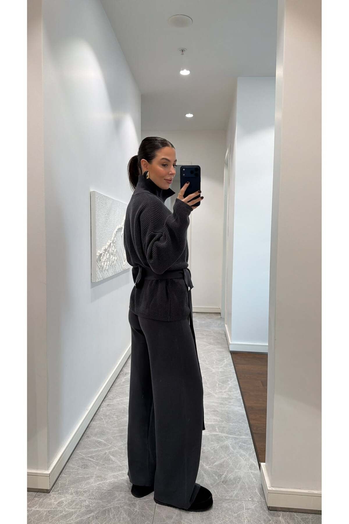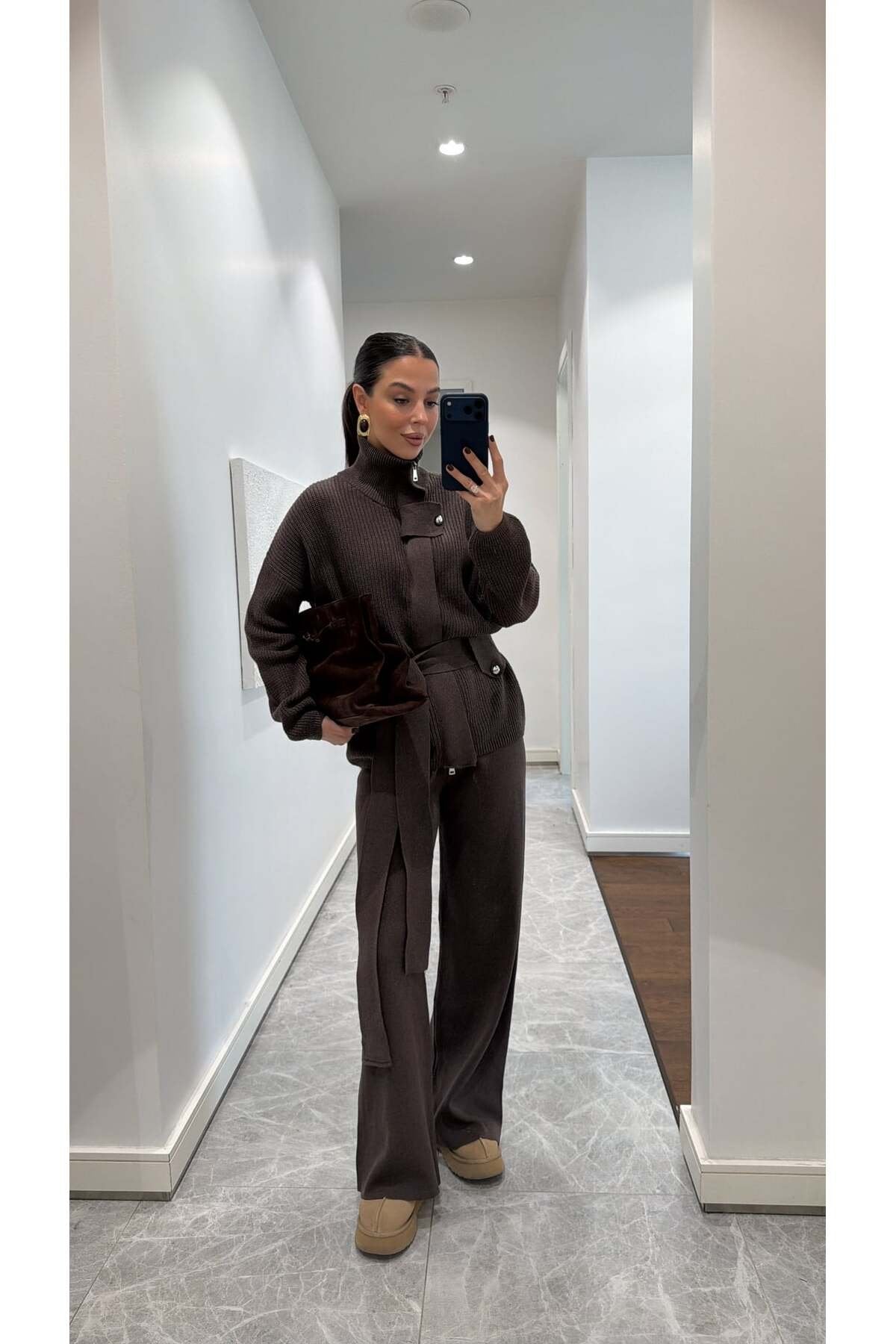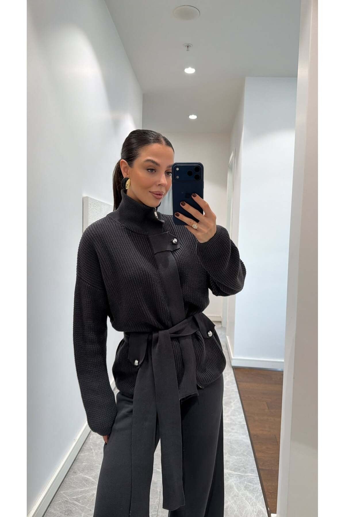 Bu şık triko takım, hem konforu hem zarafeti bir arada sunan modern kadınların gardırobunda vazgeçilmez bir parça olacak. Yumuşacık dokusu ve oversize kesimiyle gün boyu rahatlık sağlayan takım, bel kısmındaki kuşak detayıyla vücut formunu zarifçe ortaya çıkarır. Yüksek yakası ve iri düğme detaylarıyla minimal ama güçlü bir stil sunarken, geniş paça triko pantolonu modern bir siluet oluşturur.