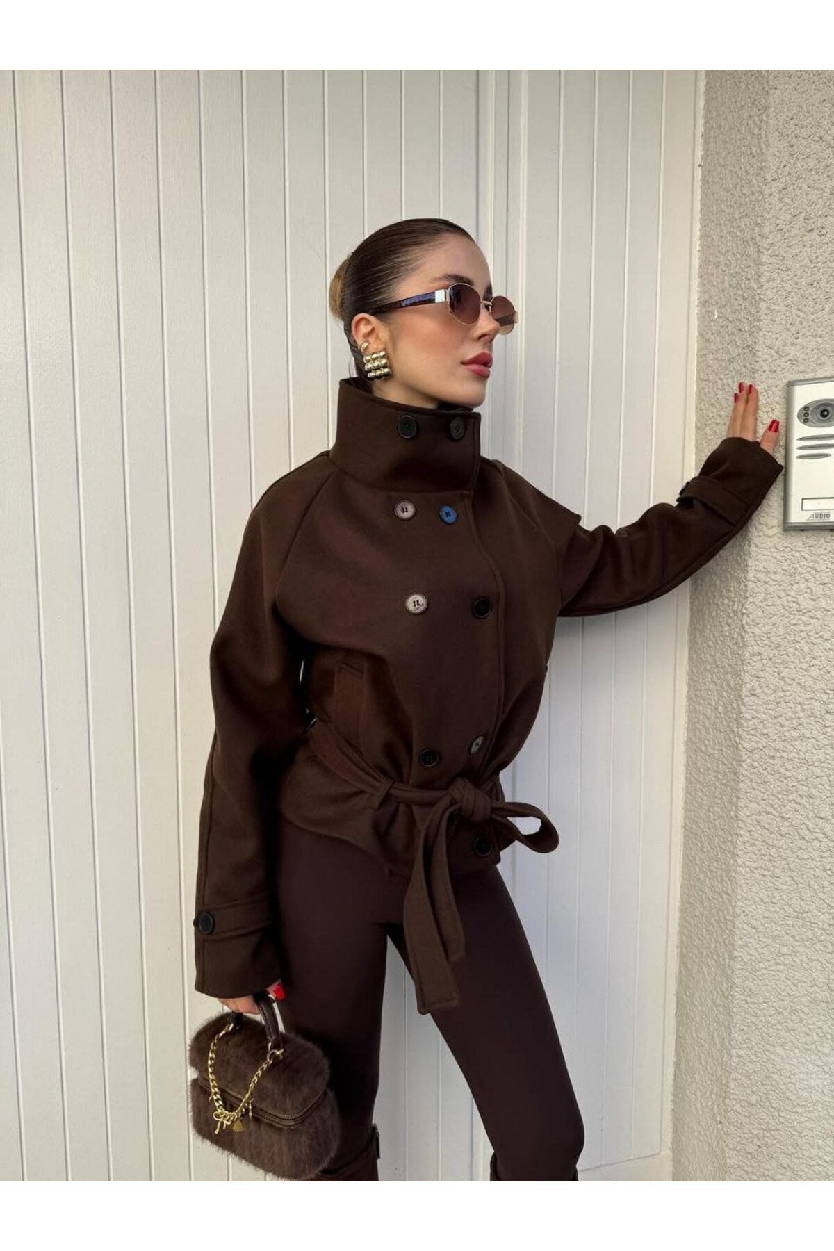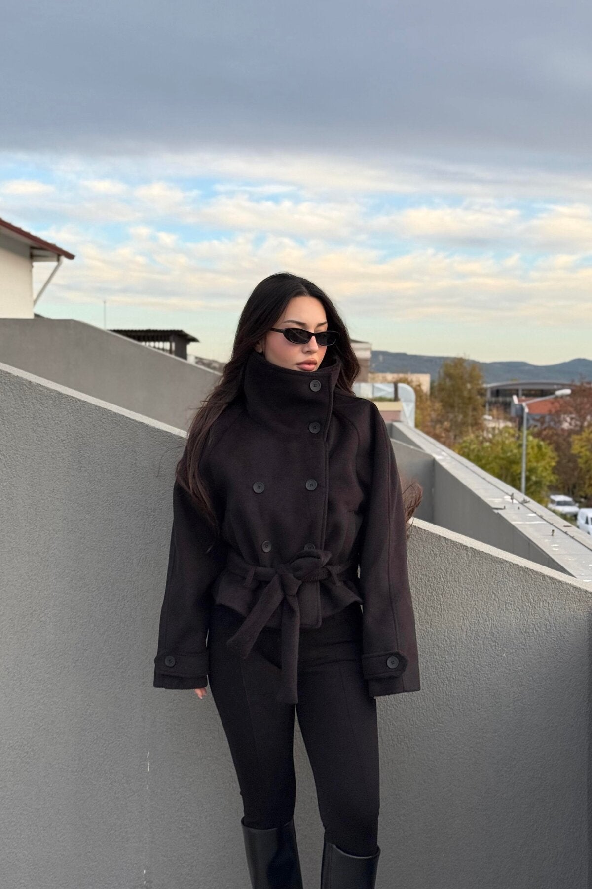 KADIN DİK YAKA DÜĞME DETAY KAŞE KUŞAKLI KABAN CEKET