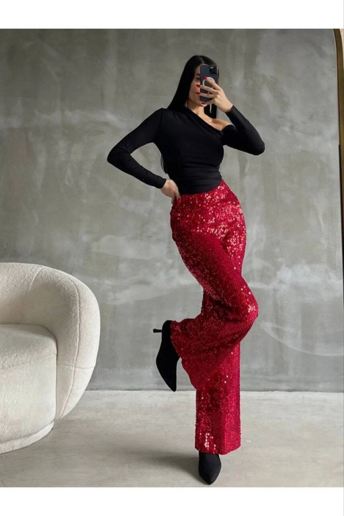 Kadın Kırmızı Pul Payet Şık Yılbaşı Özel Gün Şık Payet Pantolon