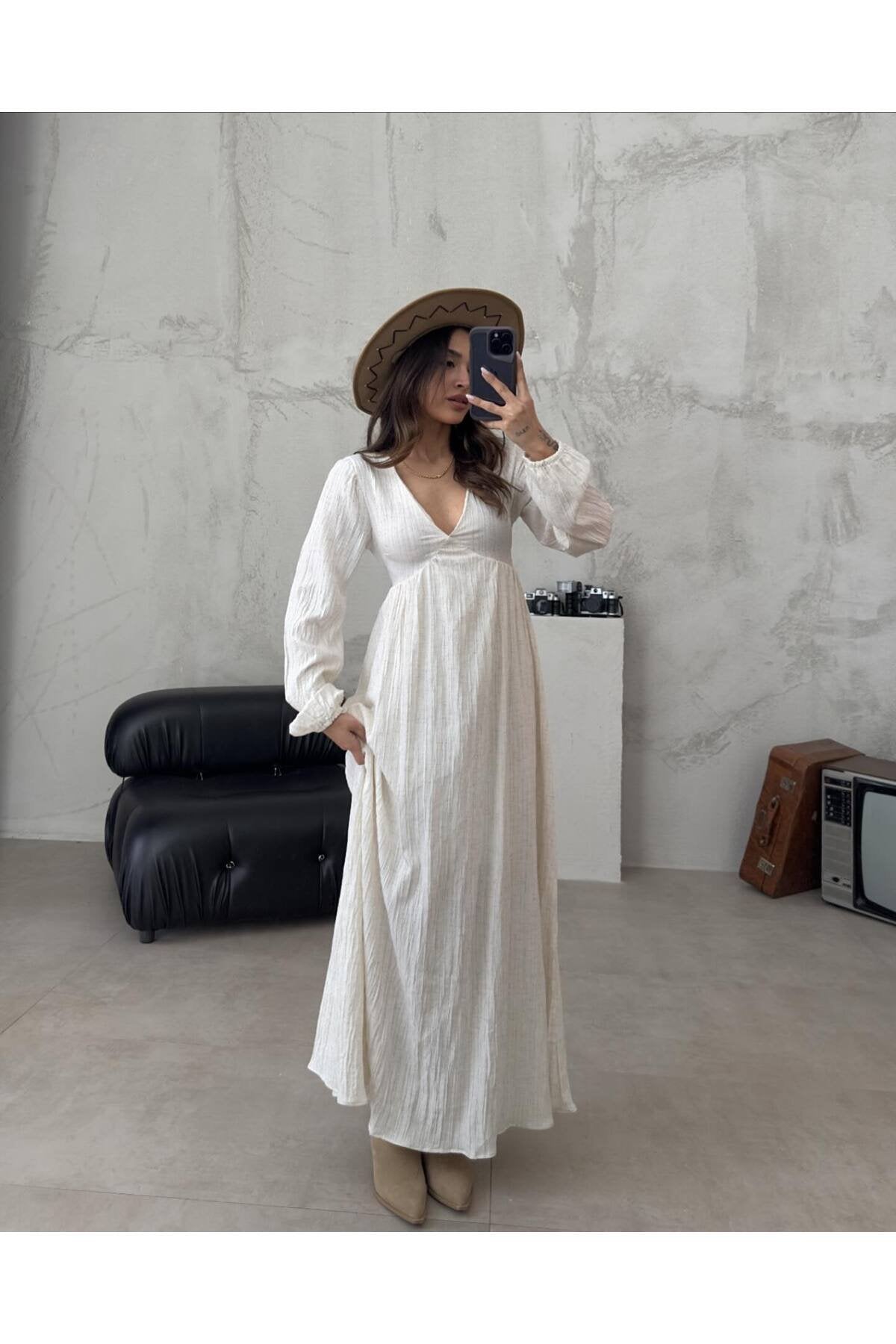 - Zarif kuşak detayı ile belinizi vurgulayan, şıklığı ve rahatlığı bir arada sunan kadın uzun gofre elbise.; - Astarlı yapısı sayesinde konforlu bir kullanım sağlarken, günlük kullanımda da idealdir.; - Kapsız tasarımıyla modern ve minimalist bir görünüm kazandırırken, kemer detayı ile feminen çizgiler ön plana çıkar.; - Gofre dokusuyla dikkat çeken bu elbise, yaz aylarının vazgeçilmez parçasıdır; hafifliğiyle sıcak günlerde serinlik hissi verir.; - Young koleksiyonuna ait bu parça, genç ruhunuzu yansıtacak şekilde tasarlanmıştır; dinamik ve trend odaklıdır.; - Orta kalınlığındaki kumaşıyla mevsim geçişlerinde de rahatlıkla tercih edilebilir; yazdan sonbahara kadar idealdir.; - Cepsiz yapısı pratikliği arttırırken, V yaka detayı zarif boynunuza sofistike bir dokunuş ekler.; - A-line/kloş silueti sayesinde farklı vücut tiplerine uyum sağlayarak feminen hatları ön plana çıkartır.; - Keten görünümlü materyali doğal bir şıklık katarken uzun kol boyu serin havalarda koruma sağlar.; - Düz deseniyle sadelikten yana olanların tercihi olup her tür aksesuarla kolayca kombinlenebilir.